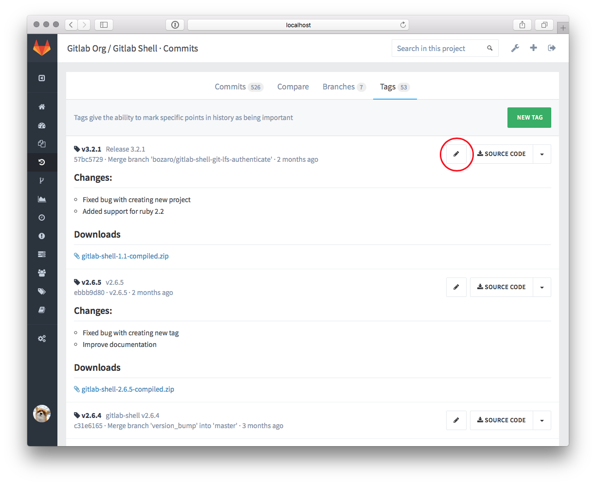 Tags page with button to add or edit release notes for existing git tag